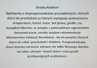 Informacja o czynnikach ryzyka COVID-19 zarówno u dziecka, jego rodziców lub opiekunów, jak i innych domowników oraz odpowiedzialności za podjętą decyzję związaną z wysłaniem dziecka na zajęcia, jak i dowożeniem dziecka do instytucji. Rodzicu! W celu zapewnienia bezpieczeństwa podopiecznych i personelu, w tym ciągłości pracy placówki dziecko...